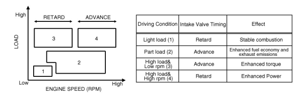 The intake/ exhaust valve timing is optimized by CVVT system depending on engine rpm.