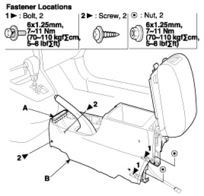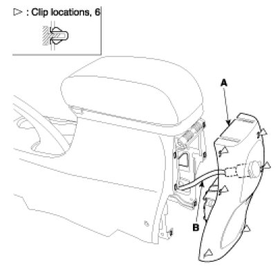 3. After disconnecting the seat warmer connector (A), remove the console assembly (B).