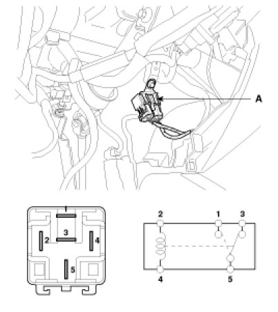 Remove the door lock and unlock relay(A) from the cross member bracket, then check for continuity between the terminals.