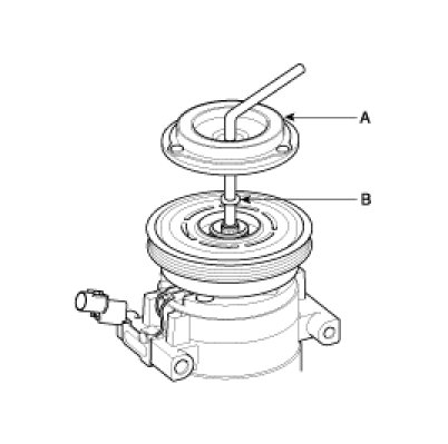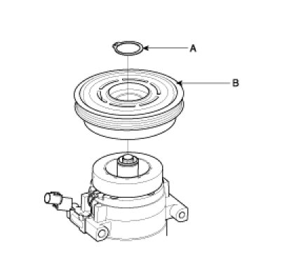 - Be careful not to damage the pulley (B) and compressor during removal/installation.