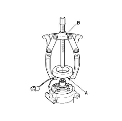 Remove the field coil (A) from the shaft with a puller (B). Be careful not to damage the coil and compressor.