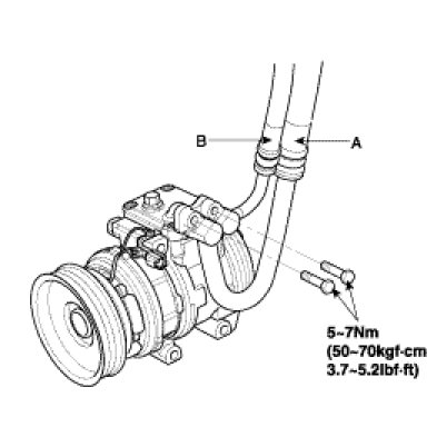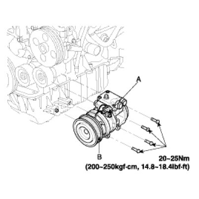 6. Disconnect the compressor clutch connector (A), then remove the mounting bolts and the compressor (B).