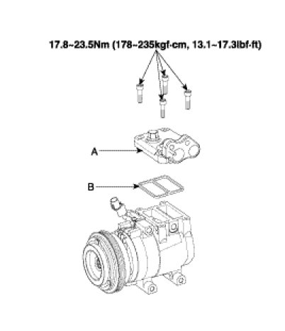 7. Using a hexagon wrench (6mm) remove the bolts, the manifold assembly (A) and the gasket (B) from the compressor.