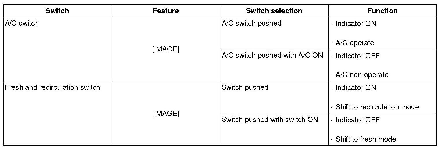 The intake switch controls the intake door used to regulate the intake air flow of the air conditioning system. The switch contains an electrical circuit used to control the actuator that is connected to the intake door.