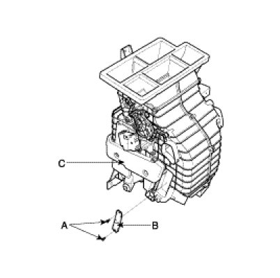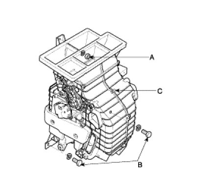 8. Remove the mounting nut(A), the mounting bolts(B) and heater & evaporator unit(C).