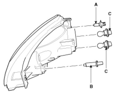 Replace the head lamp bulb(A), position bulb(B) and turn signal bulbs(C).