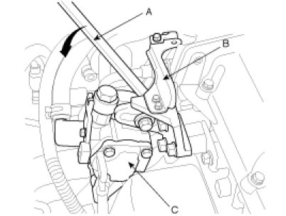 (2) Put a bar(A) or equivalent, between the bracket(B) and the oil pump(C) and adjust the tension so that the belt deflection is within the standard value.