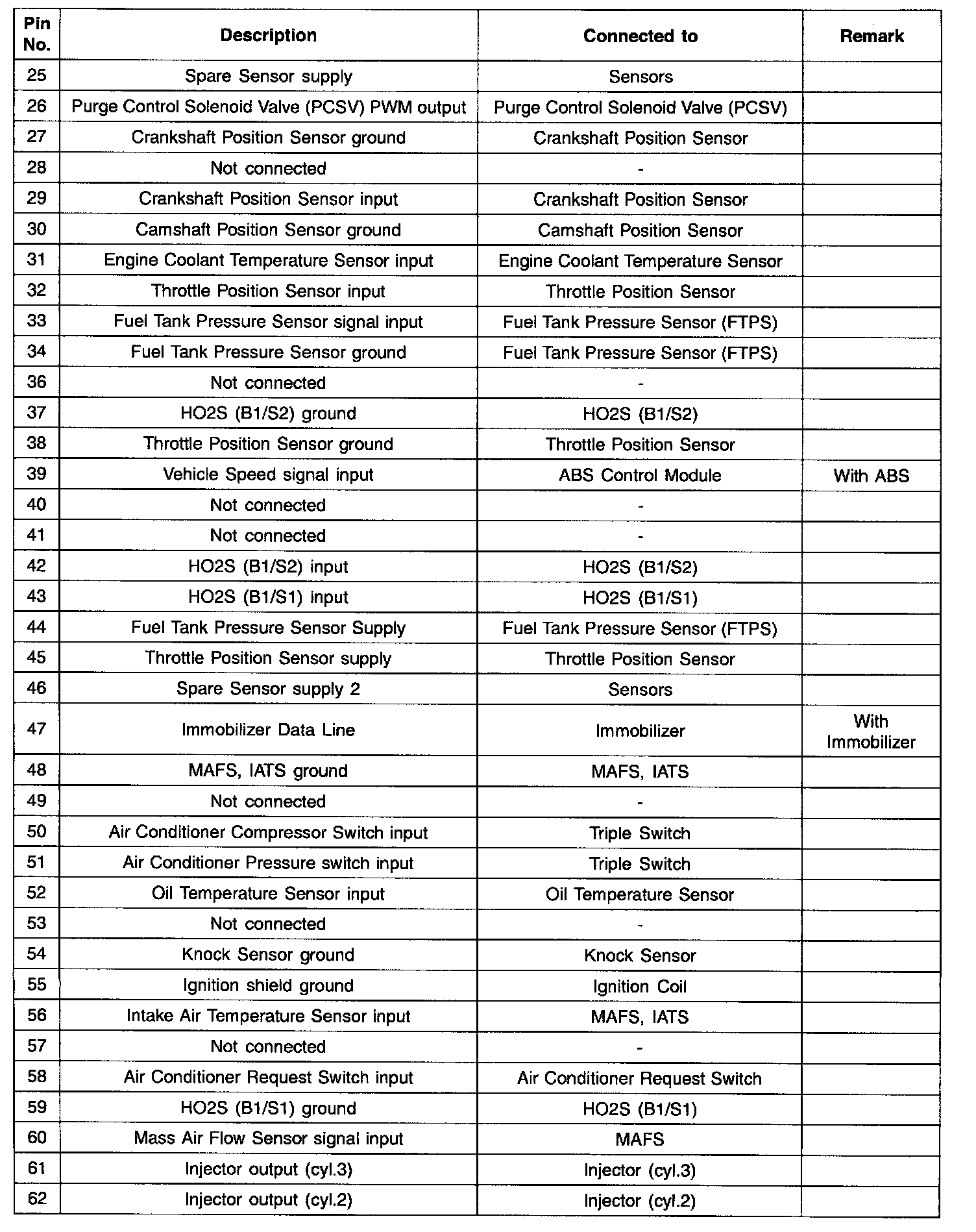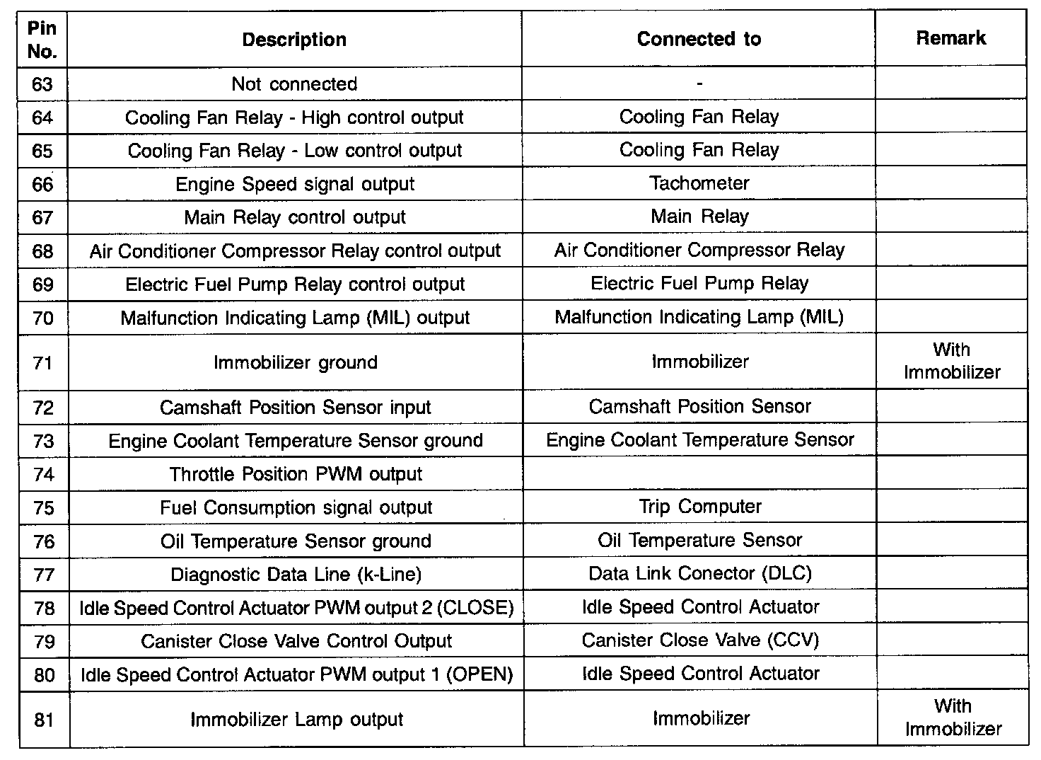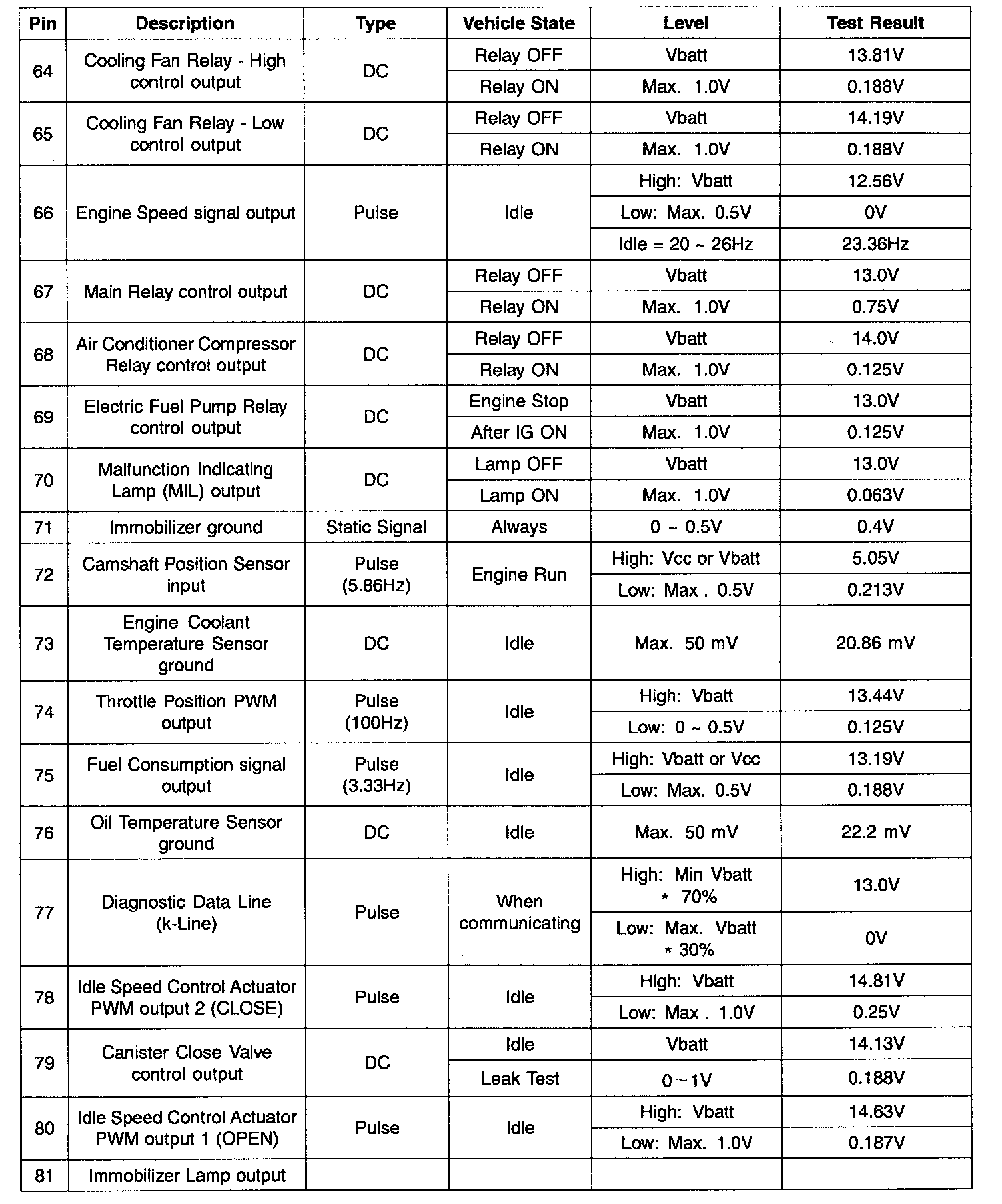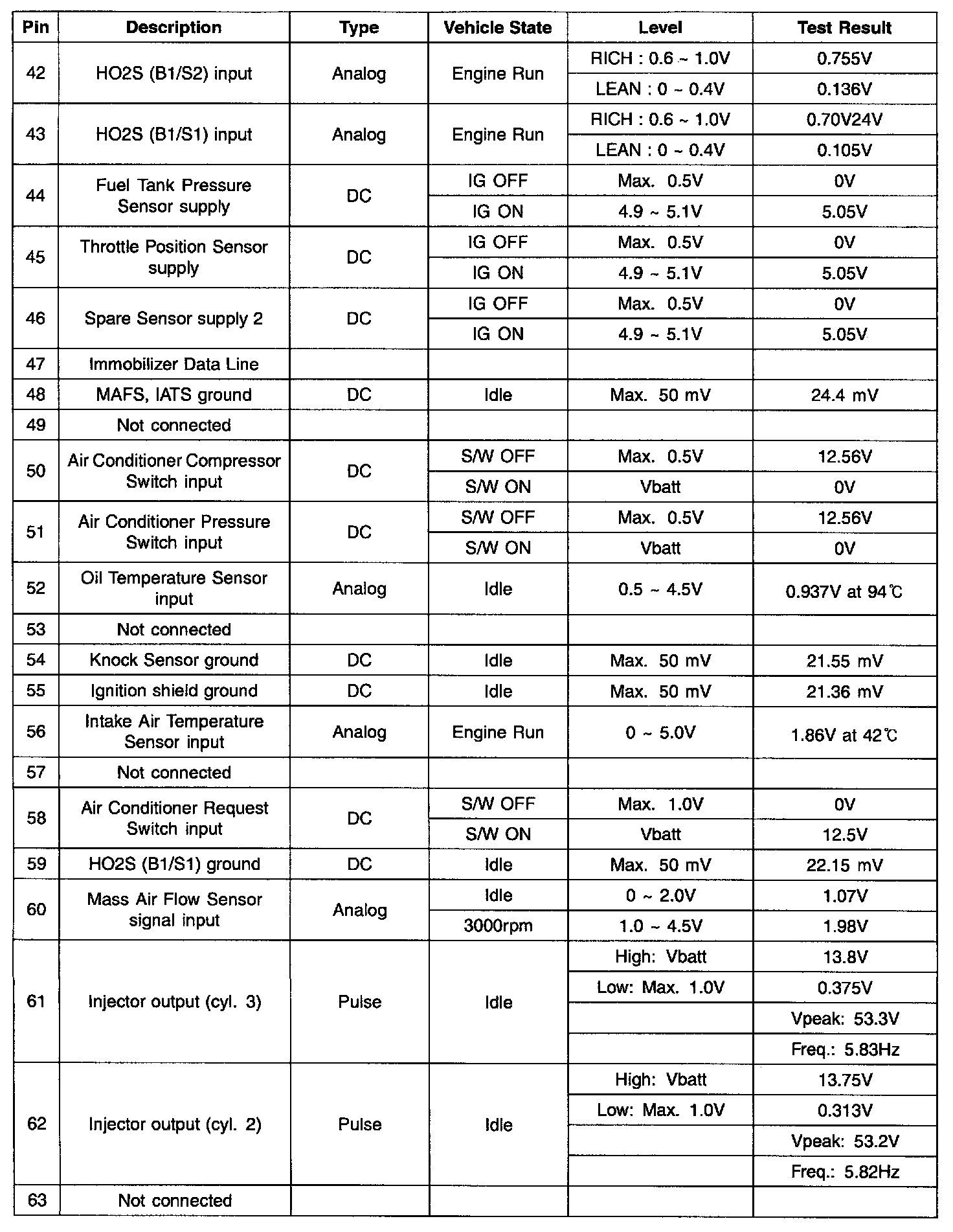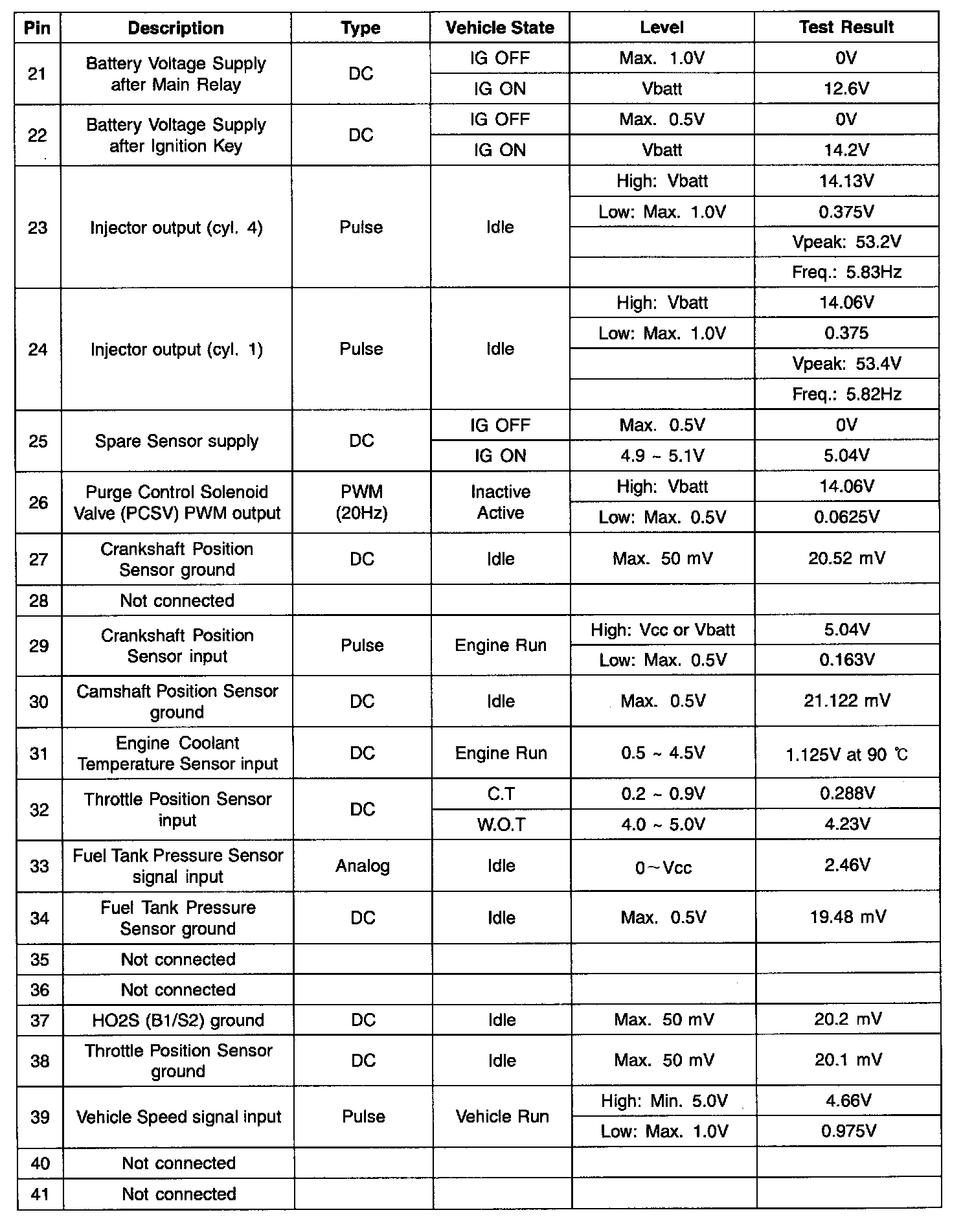 Pinout Values and Diagnostic Parameters