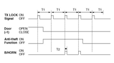 (1) If "LOCK" button of the transmitter is pushed, when 4 doors are closed, the burglar alarm horn operates for 'T2', 4 secs(T1) after engaging "LOCK" button.