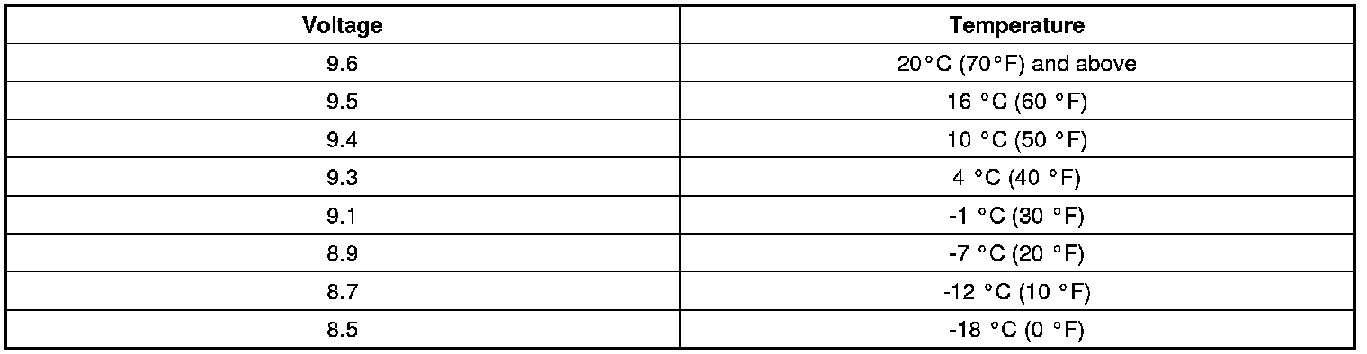 E. Compare the voltage reading with the minimum and replace the battery if battery test voltage is below that shown in the voltage table.