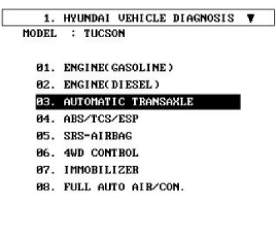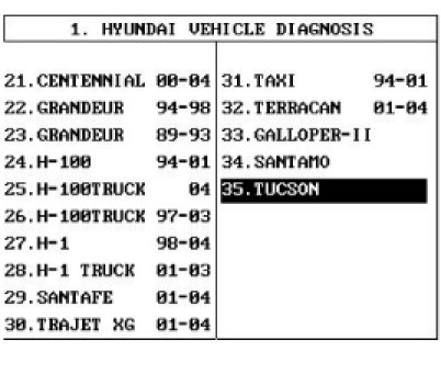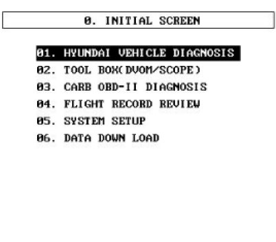 Having connected and turned on scan tool, the vehicle and system selection must be made from the 1.0 HYUNDAI VEHICLE DIAGNOSIS SCREEN.