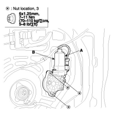 2. After disconnecting the connector (A), remove the power window motor (B).
