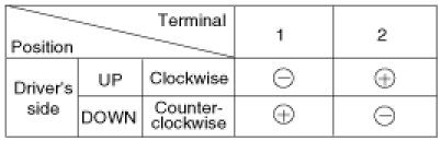 3. Connect the motor terminals directly to battery voltage (12V) and check that the motor operates smoothly. Next, reverse the polarity and check that the motor operates smoothly in the reverse direction. If the operation is abnormal, replace the motor.