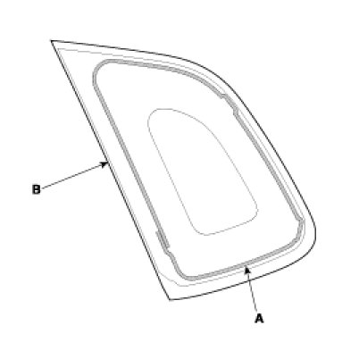 5. Pack adhesive into the cartridge without air pockets to ensure continuous delivery. Put the cartridge in a caulking gun, and run a bead of sealant (A) around the edge of the quarter fixed glass (B) as shown. Apply the adhesive within 30 minutes after applying the glass primer. Make a slightly thicker bead at each corner.