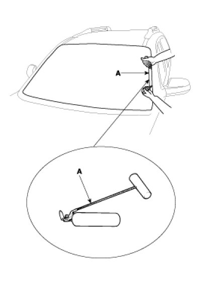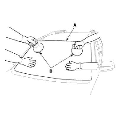 10. Use glass holder (A) to hold the windshield over the opening, align it with the alignment marks (B) made in step 15, and set it down on the adhesive. Lightly push on the windshield until its edges are fully seated on the adhesive all the way around. Do not open or close the doors until the adhesive is dry.