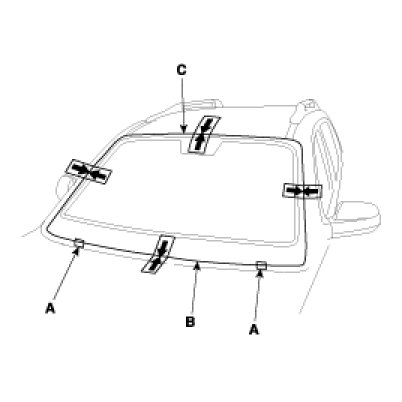 3. Apply the glass primer (A) to the side of the windshield glass edge and stick the both-sided adhesive tape (B) on the inside of molding (C).
