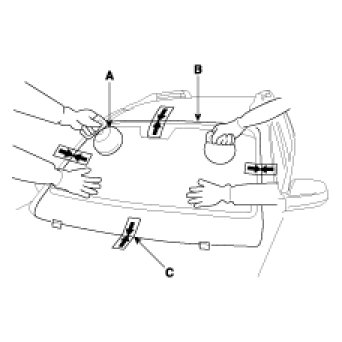 5. Install the spacer (A) install the windshield glass (B) temporarily with making sure to position them on the center, and then place the alignment mark (C).
