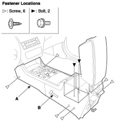 6. Disconnect the connector (B), then remove the rear floor console.