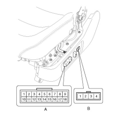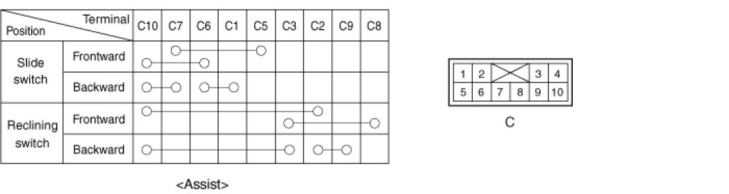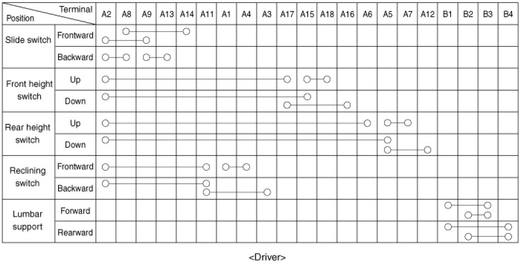 power seat switch in each position, make sure that continuity exists between the terminals below. If continuity is not as specified, replace the power seat switch.
