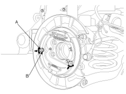 12. Remove the retaining ring(B) from the parking brake wire(A) which is in the rear side of the backing plate.