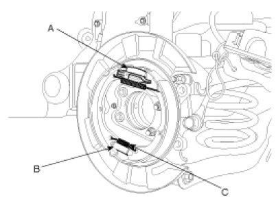 13. Remove the parking brake wire connecting hook(C) from the brake shoe.