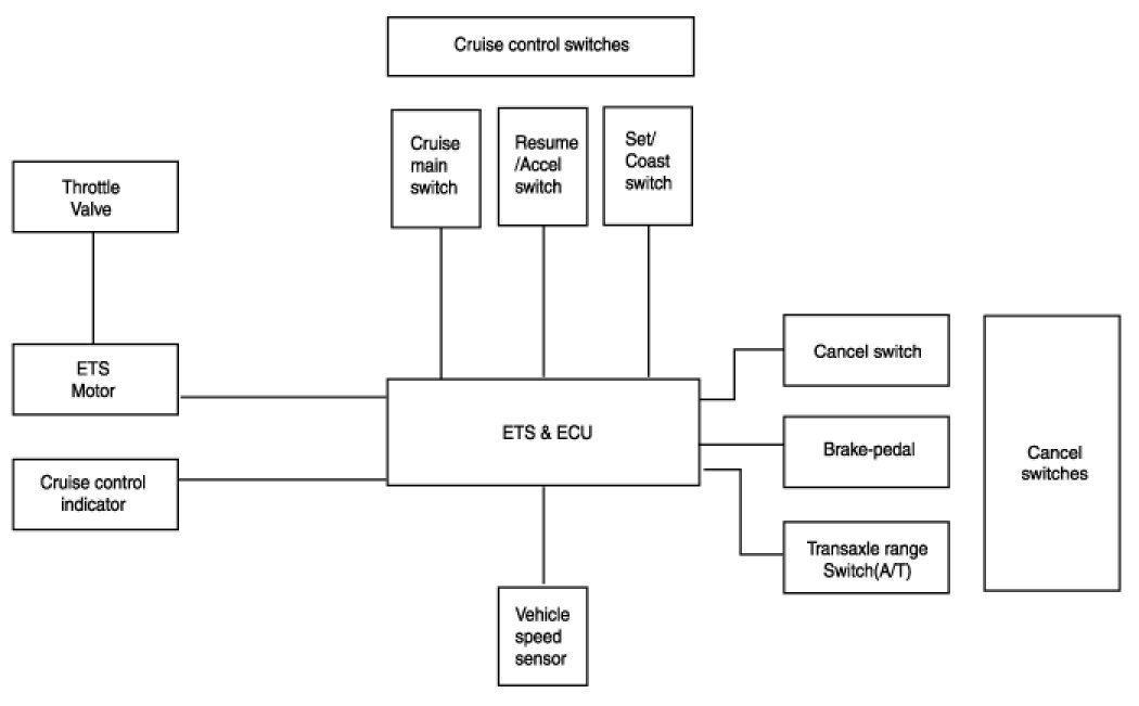 The main components of cruise control system are mode control switches, transaxle range switch, brake switch, vehicle speed sensor, ECM and ETS motor that connect throttle body.