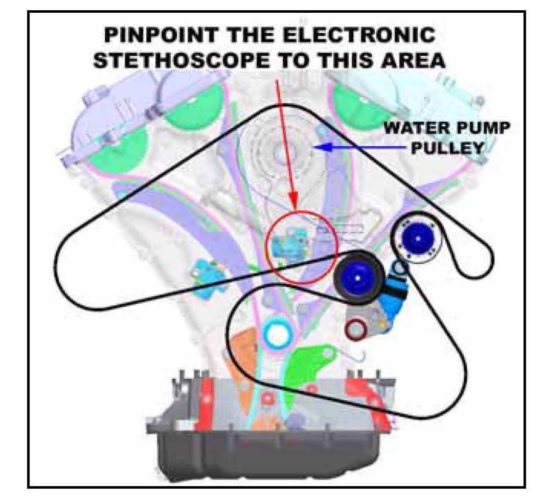 NOTE: If any start-up noise is observed, then restart engine after 10 minutes and listen to the specific area shown below with an electronic stethoscope (or equivalent). Repeat this several more times to confirm the source point of the brief engine start-up sound before continuing on to the service procedure.