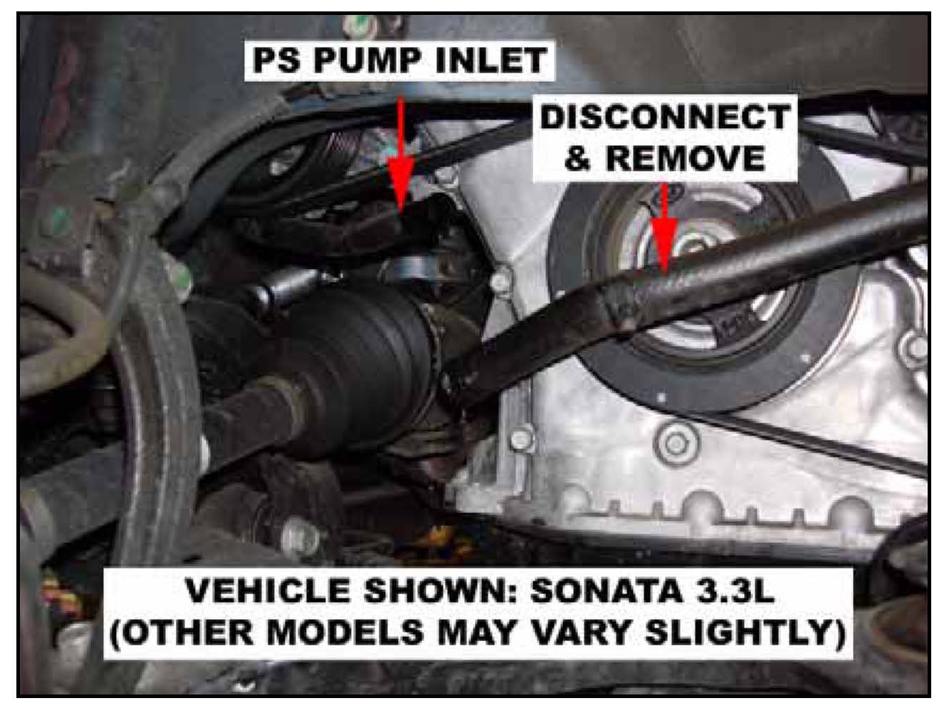 7. Drain, disconnect, and remove the hose connection between the power steering reservoir and the power steering pump.