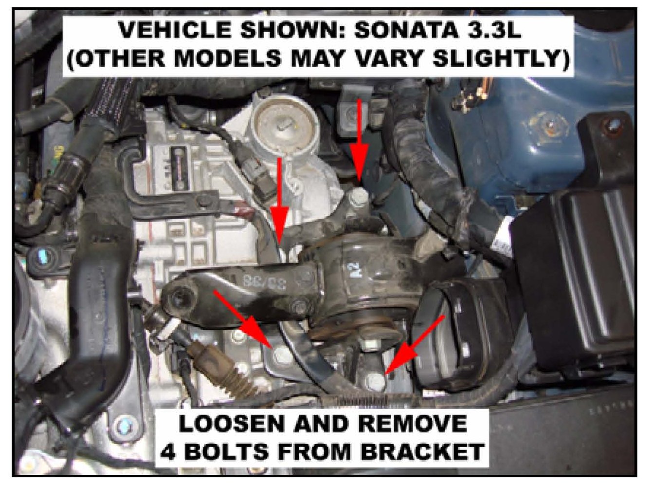 16. Sonata and Azera ONLY: Support the transmission case with floor jack underneath and remove 4 bolts from the LH upper mounting bracket of the automatic transmission.