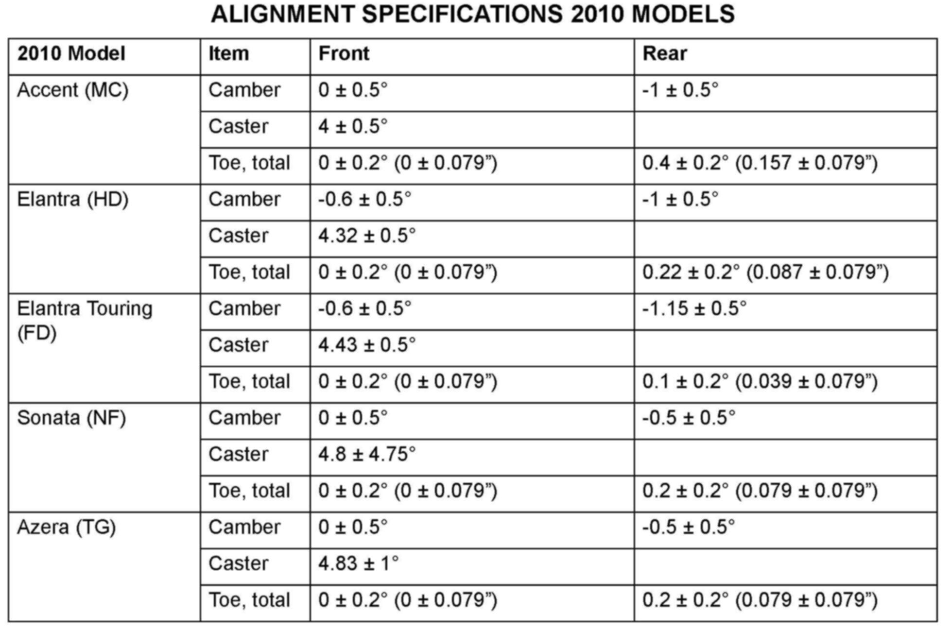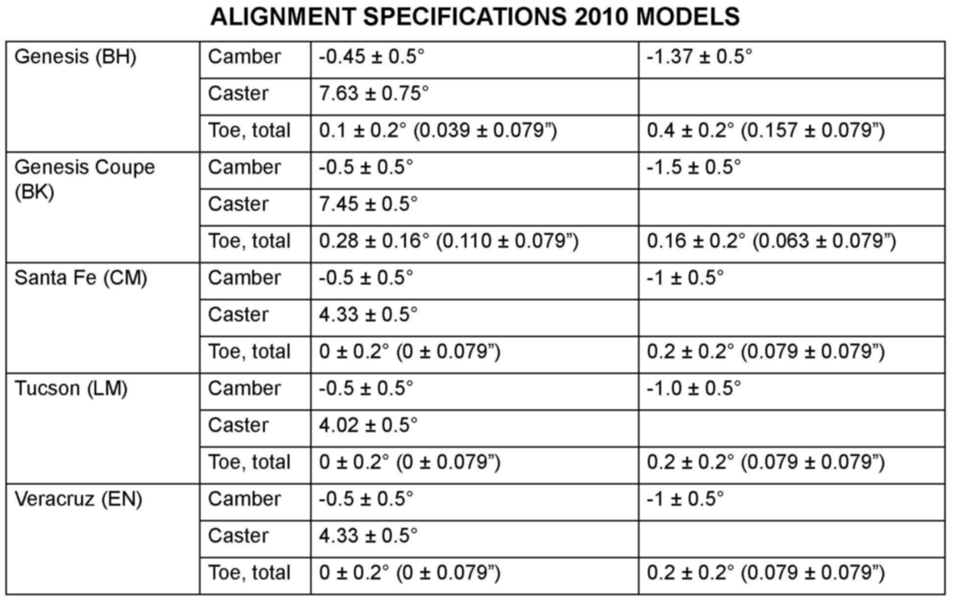 ALIGNMENT SPECIFICATIONS 2010 MODELS
