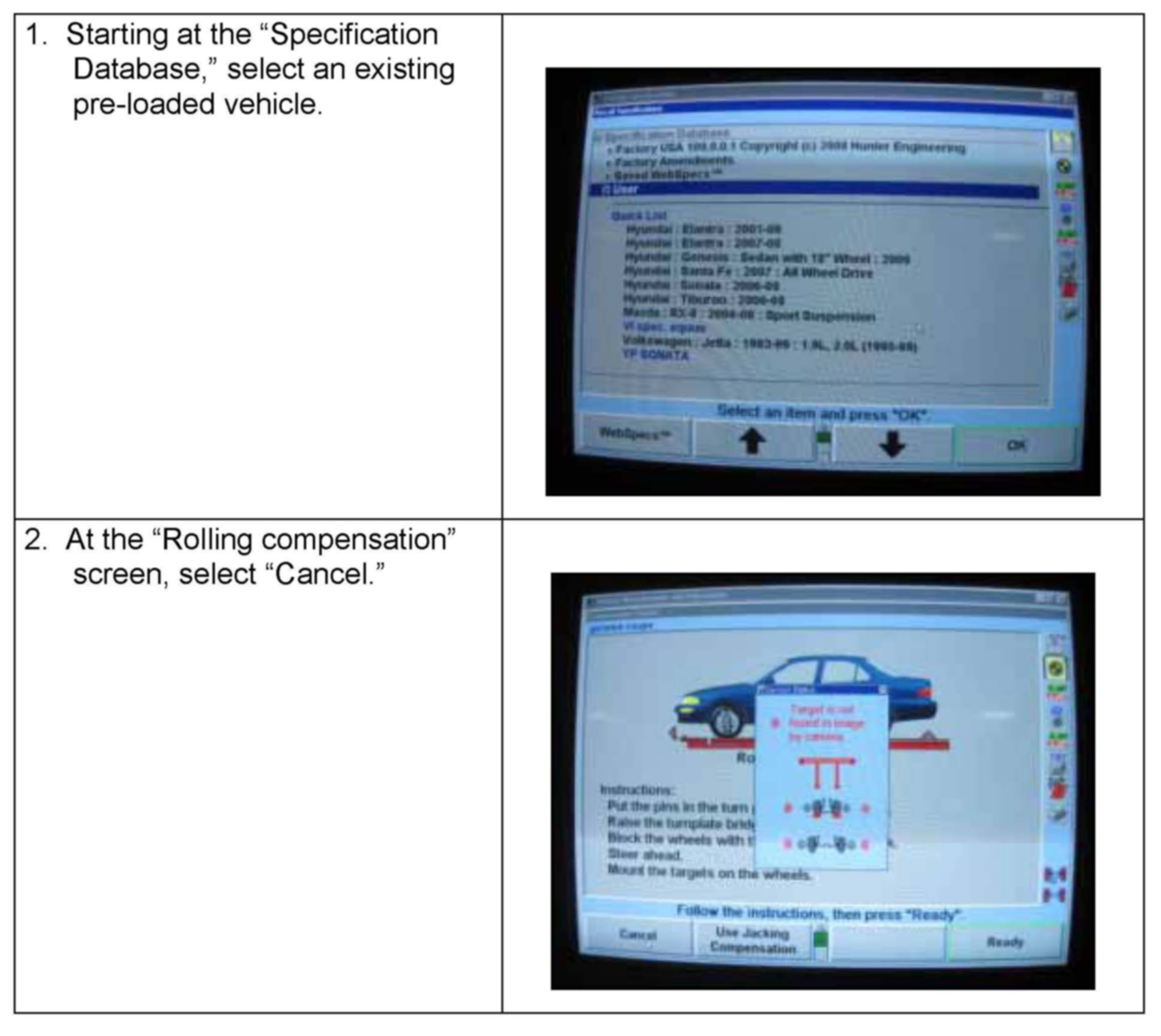 The rack used is a Hunter DSP400, which has the option of modifying or adding alignment specifications and tolerances. This can be useful when new models are introduced and the machine has not been accordingly updated. The following procedure details this process for this specific alignment rack. Consult your local representative for details on your rack.
