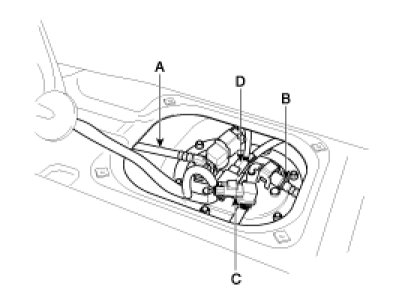 2. Disconnect Suction Tube Quick-Connector (A), Fuel Feed Quick-Connector (B), Fuel Tank Pressure Sensor Connector(C) and Fuel Pump & Sub Fuel Sender Connector (D).