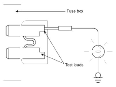 Check FusesA blade type fuse test taps is provided to allow checking the fuse itself without removing if from the fuse box. The fuse is good if the test lamp lights up when one lead is connected to the test taps (one at a time) and the other lead is grounded. (Turn the ignition switch so that the fuse circuit becomes operative)