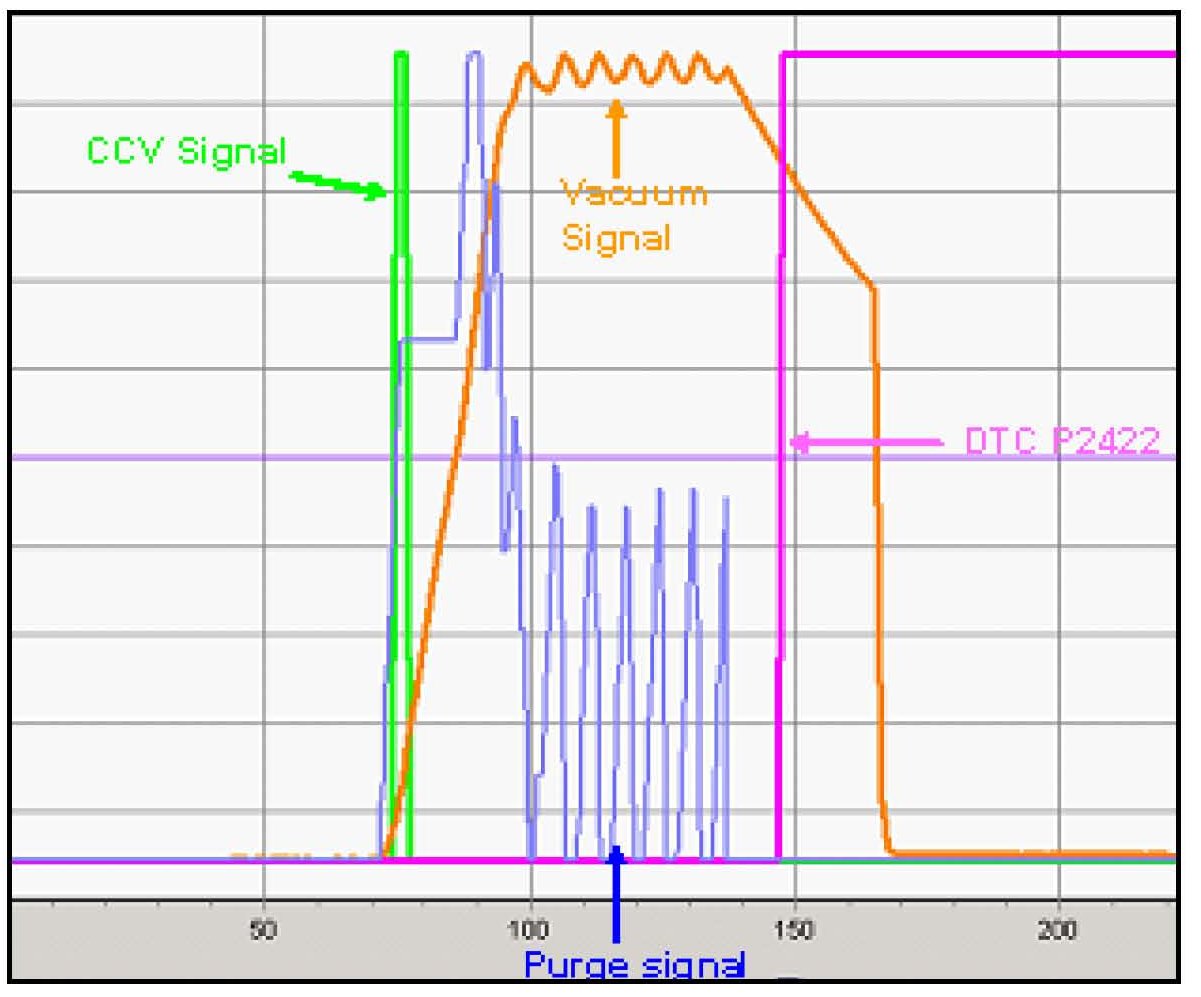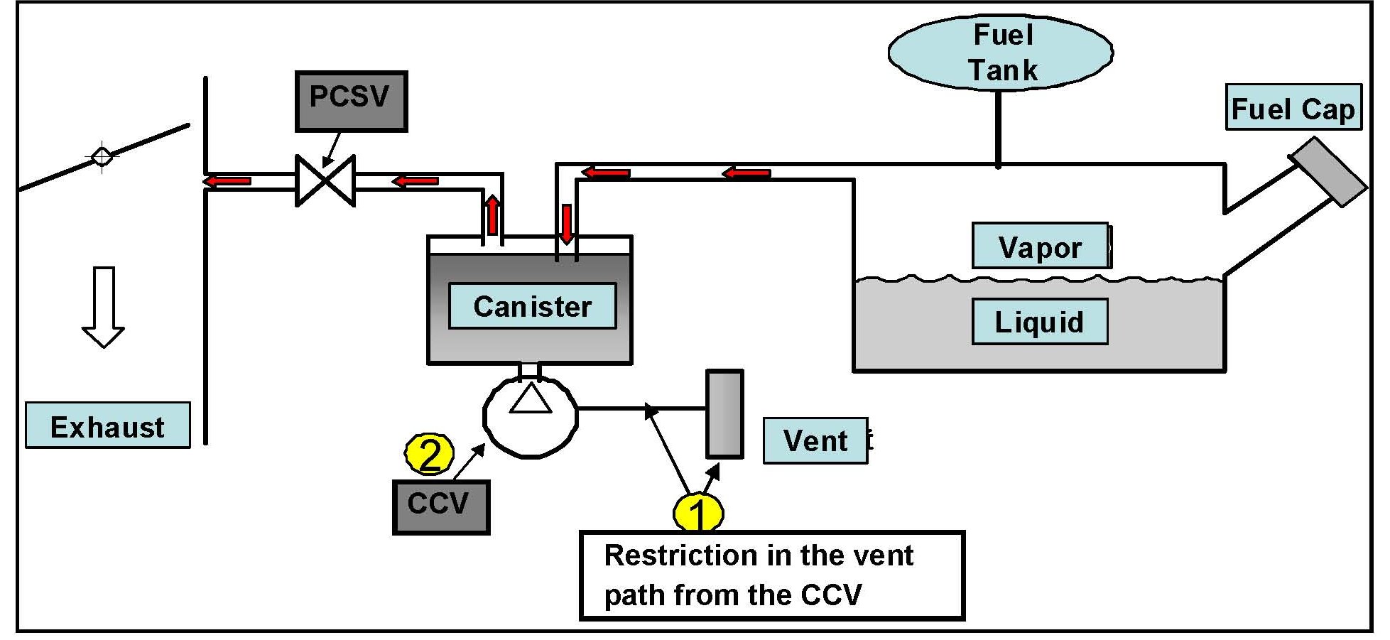^ If the system failed the above PCSV DTC P0441 test, then a supplemental diagnostic check will be performed which checks for P2422 (Vent Path Restricted). This diagnostic is accomplished by opening the normally closed purge valve and monitoring the fuel tank pressure sensor for an increase in vacuum. If the measured vacuum exceeds the threshold, then DTC P2422 is set to indicate a vent system restriction. (In some systems, P0446 may set instead.)