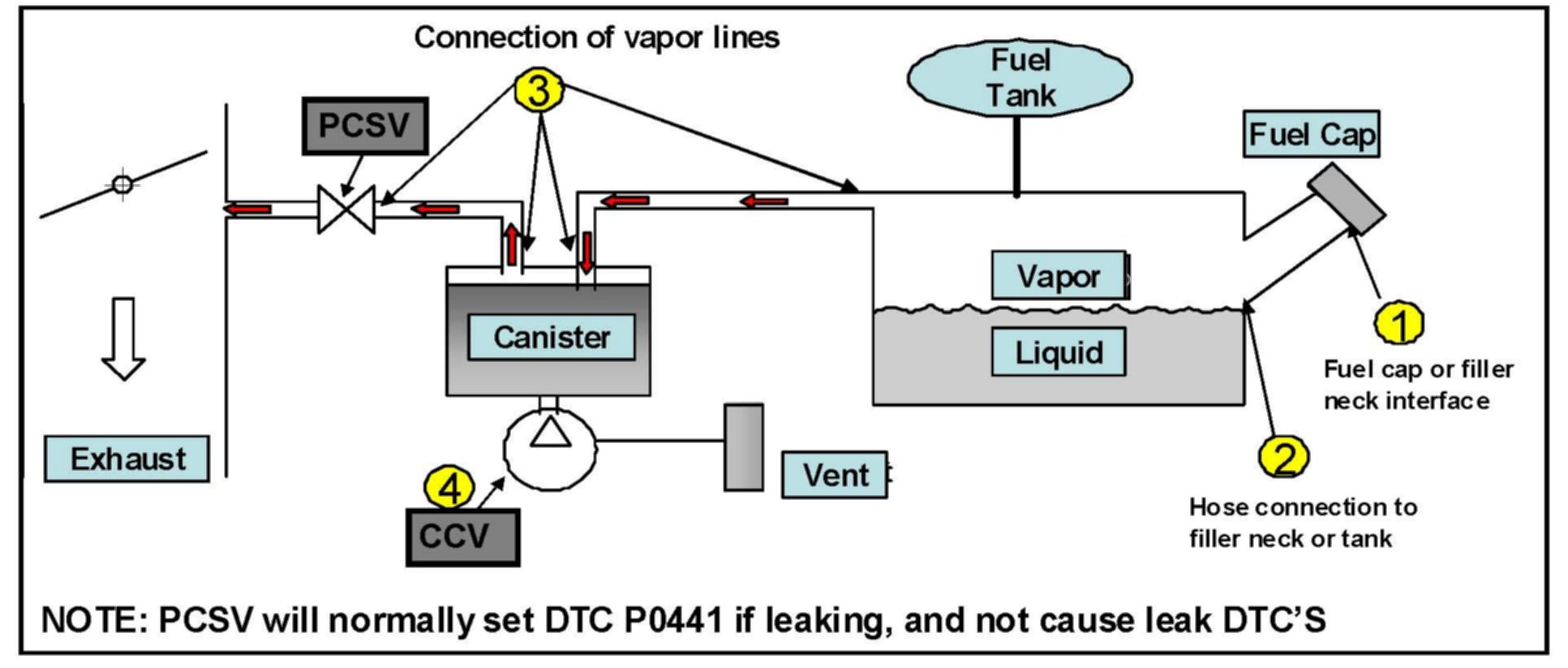 ^ The first check performed is to confirm if the PCSV is closing completely or is leaking vacuum. Resulting DTC is P0441 (Purge Flow Incorrect).