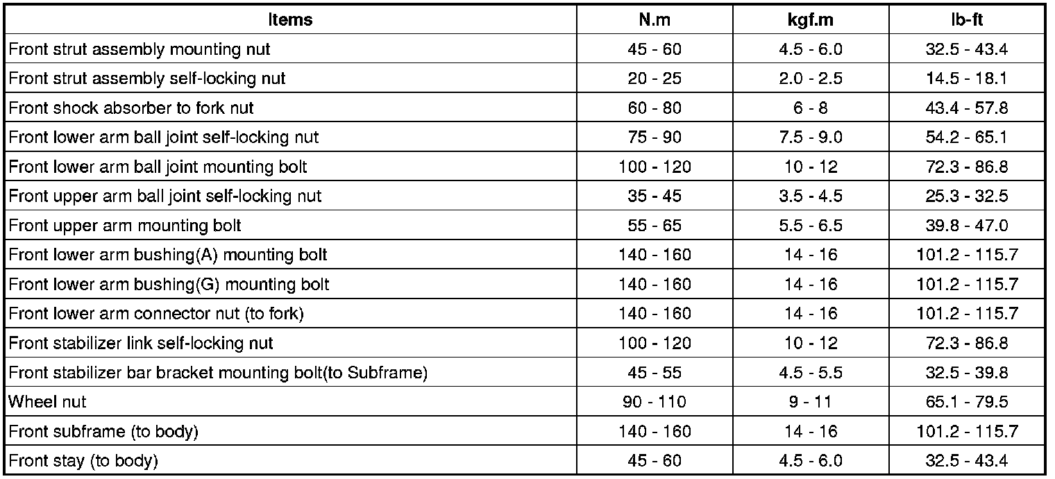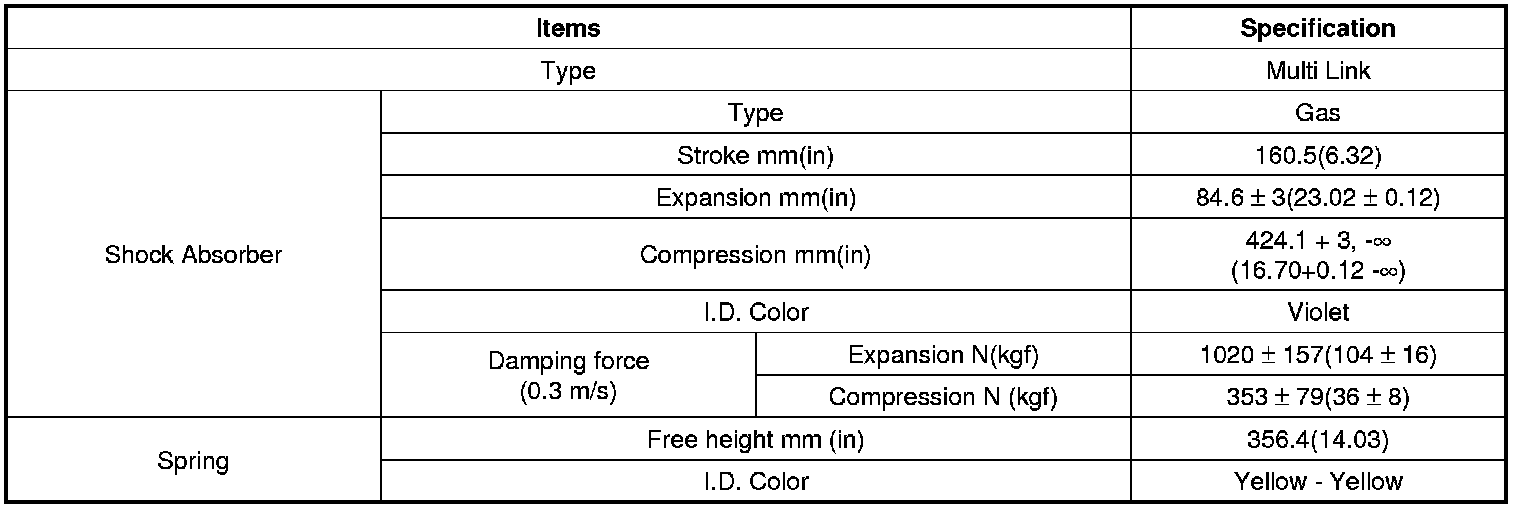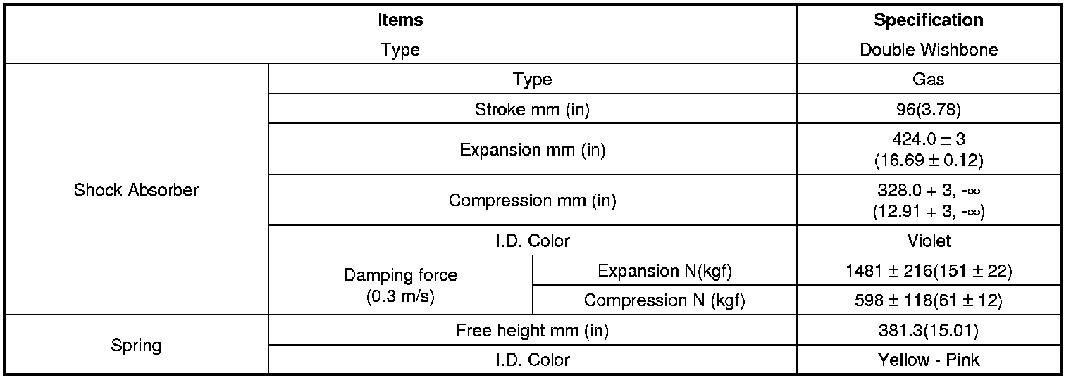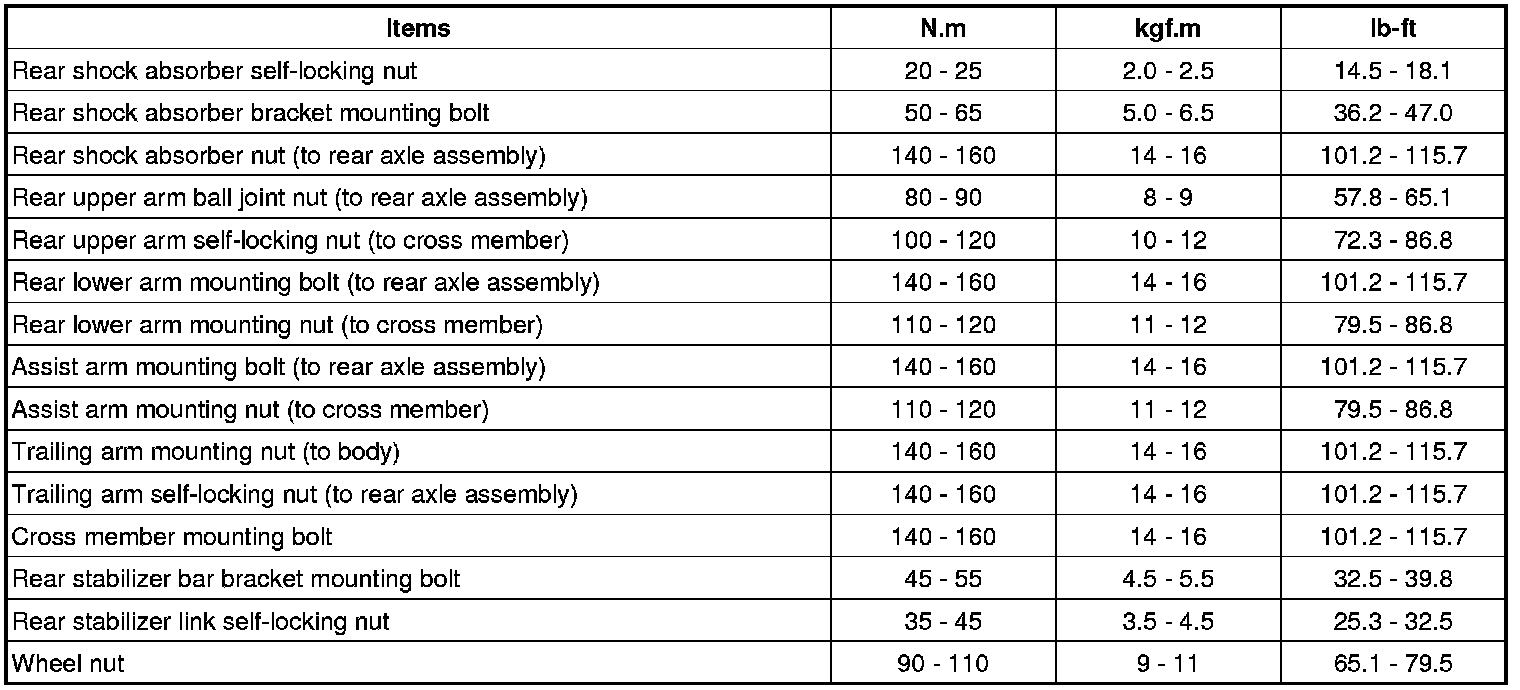 SpecificationsFront Suspension SystemRear Suspension SystemTightening TorquesFront SuspensionRear SuspensionCAUTION:Replace the self-locking nuts with new ones after removal.