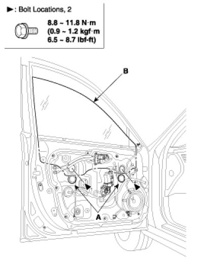3. Carefully move the glass (B) until you can see the bolts, then loosen them. Separate the glass from the glass run and carefully pull the glass out through the window slot.