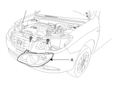 2. Loosen the mounting bolts (2EA) of head lamp. Remove the head lamp assembly (A) after disconnecting the lamp connectors.