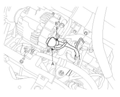 2. Disconnect the alternator connector(B) and cable(A).