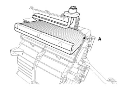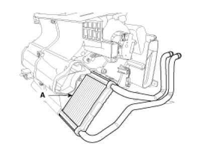 11. Be careful that the inlet and outlet pipe are not bent during heater core removal, and pull out the heater core (A).
