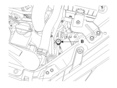 1. Connect an R-134a refrigerant Recovery/Recycling/Charging System (A) to the high-pressure service port (B) as shown, following the equipment manufacturer's instructions.