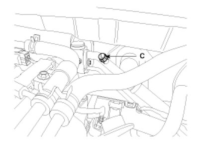 1. Connect an R-134a refrigerant Recovery/Recycling/Charging System (A) to the high-pressure service port (B) and the low-pressure service port (C) as shown, following the equipment manufacturer's instructions.