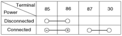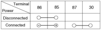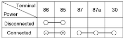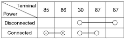 1. There should be continuity between the No.30, 87a and No.87 terminals when power and ground are connected to the No.85 and No.86 terminals.