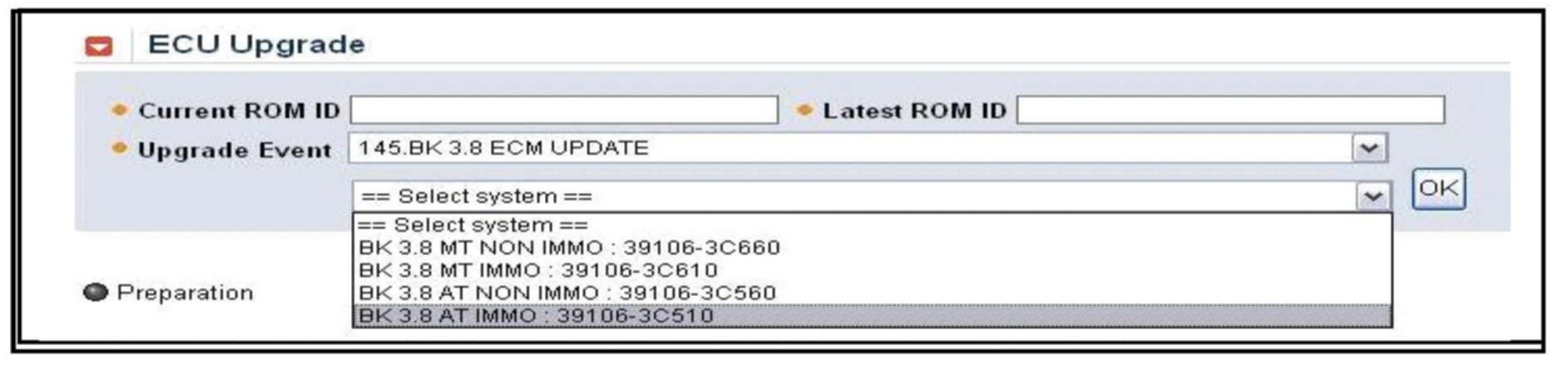 7. After the Current ROM ID is displayed, select appropriate Upgrade Event, "145.BK 3.8 ECM UPDATE."