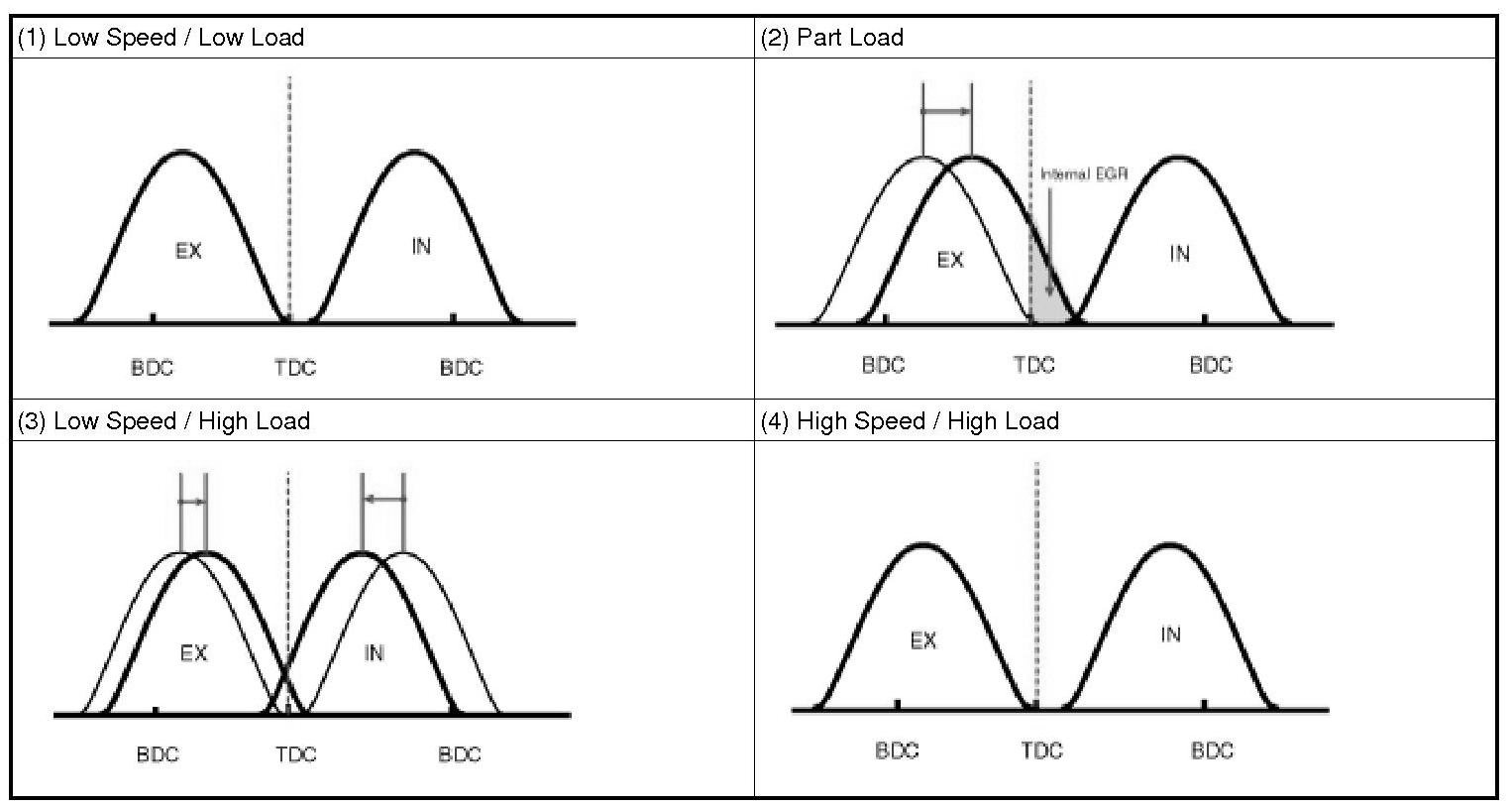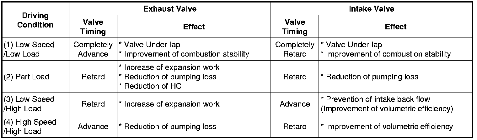 By controlling CVVT, the valve over-lap or under-lap occurs, which makes better fuel economy and reduces exhaust gases (NOx, HC) and improves engine performance through reduction of pumping loss, internal EGR effect, improvement of combustion stability, improvement of volumetric efficiency, and increase of expansion work.