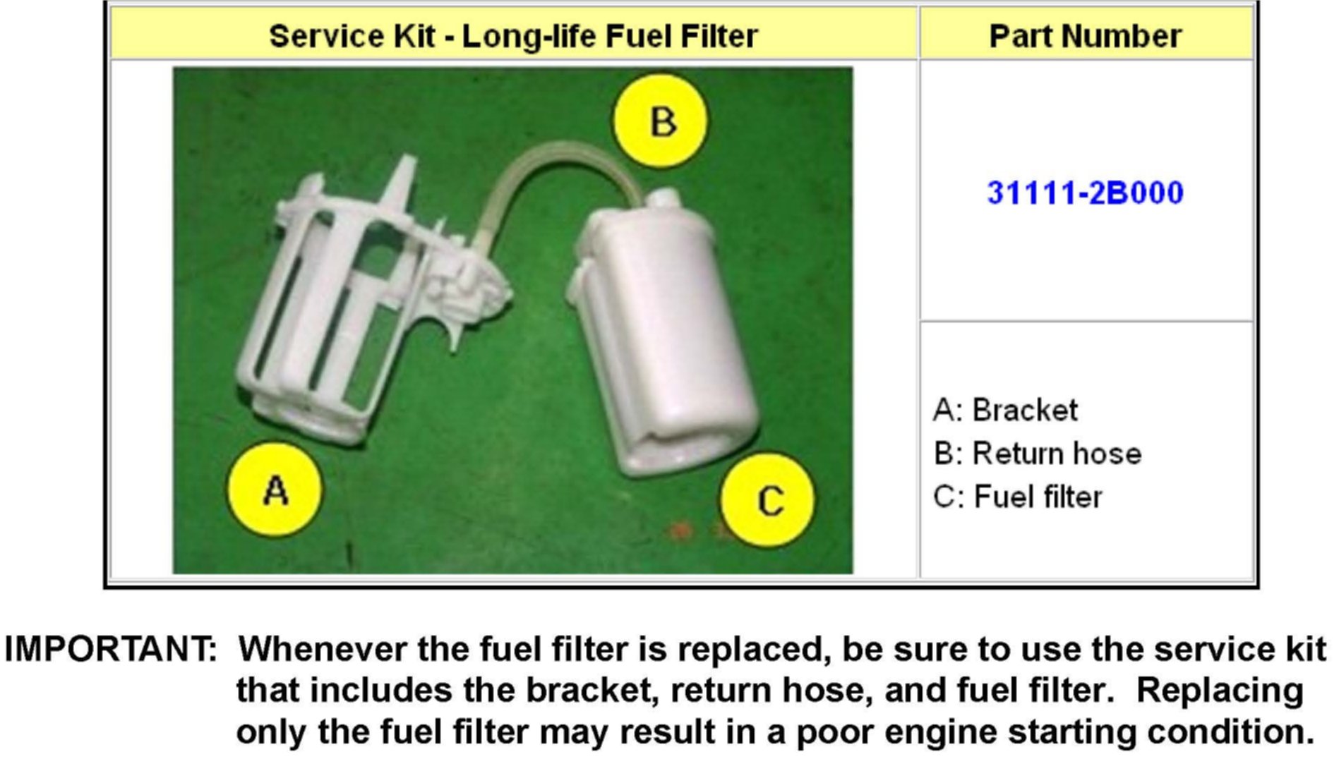 This bulletin provides information regarding the fuel filter service kit for Genesis Coupe (BK) vehicles. The fuel filter service kit outlined in this bulletin should be used whenever it is necessary to replace the fuel filter.