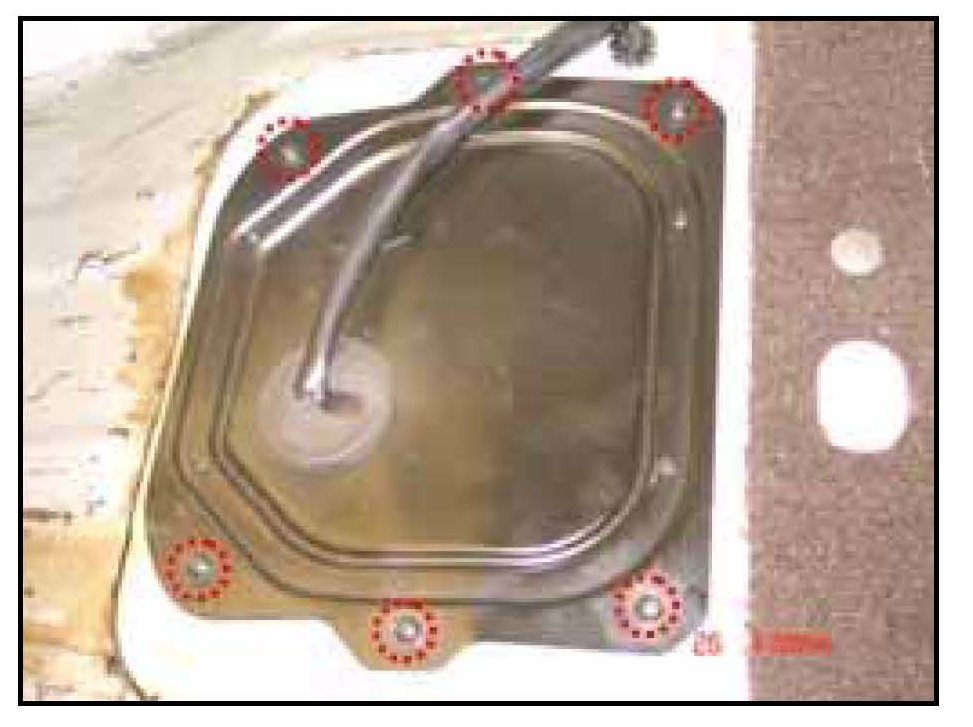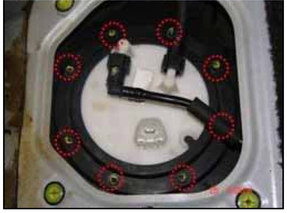 1. Remove the fuel pump service cover (located underneath the rear seat cushion) to access the fuel pump top plate screws.