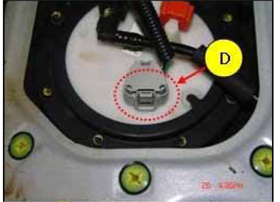 2. Release the lock tab and disconnect the fuel pump wiring connector (D).
