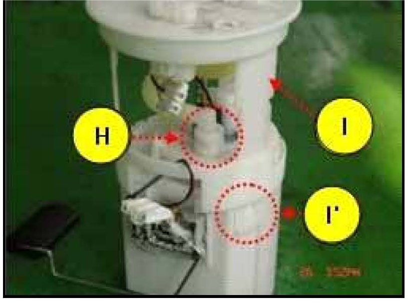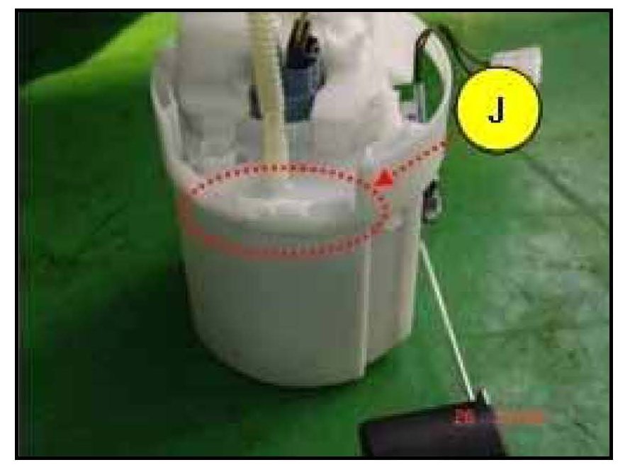 11. Once the fuel pump top plate is detached, remove the fuel filter by releasing the 2 holding hooks. (There is one at "J" and another hook located at the opposite side of "J").