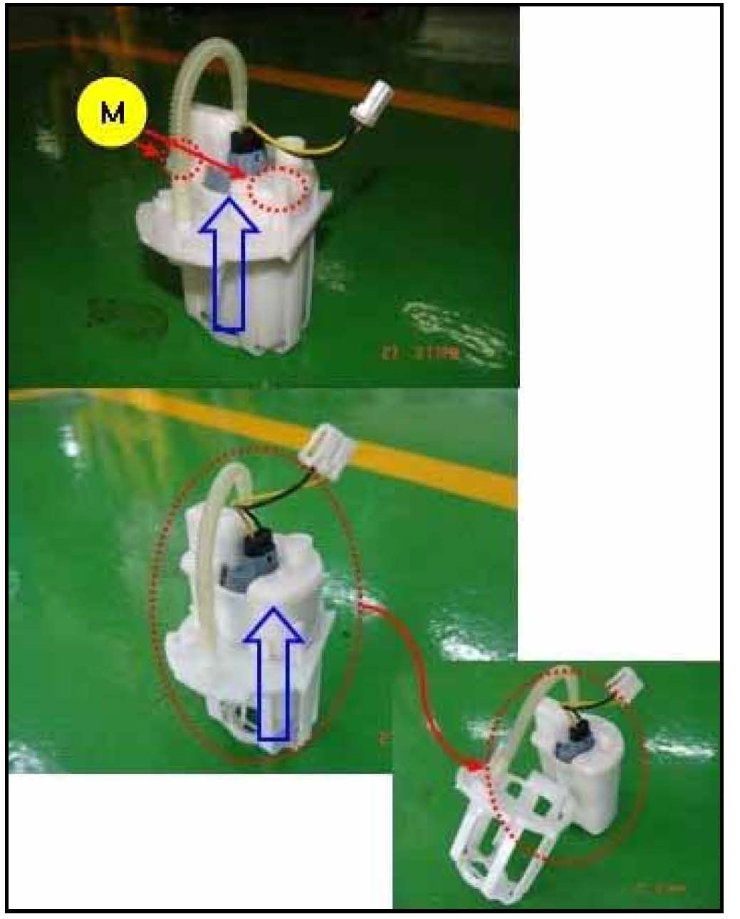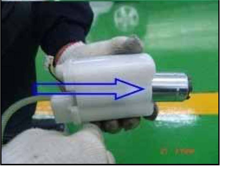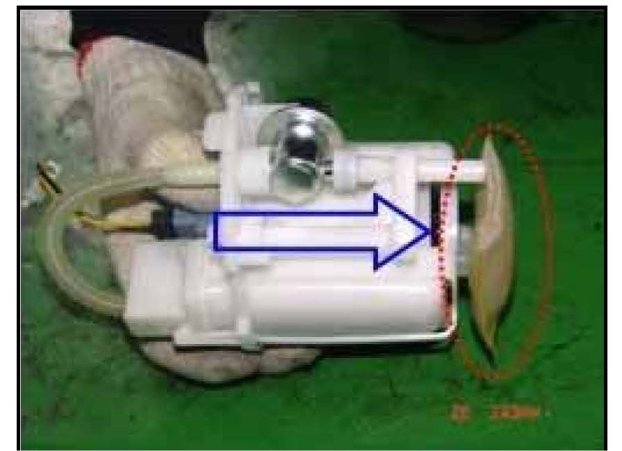 12. Remove the fuel pump pickup sock from the fuel pump by prying it away from the fuel pump inlet towards the arrow direction.